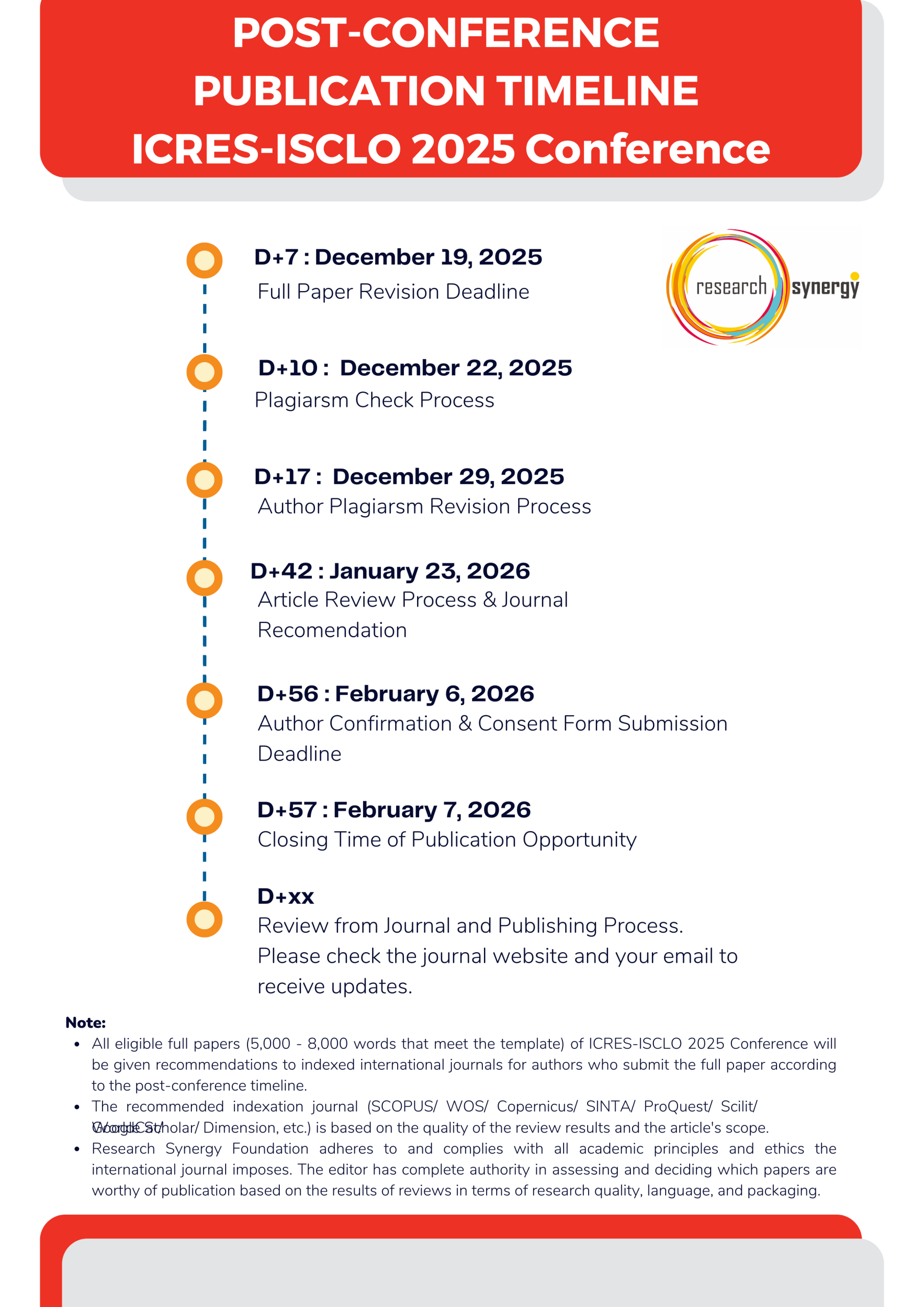 ICRES-ISCLO 25 is an annual academic conference Organized by Telkom Corporate University, Telkom University, and Research Synergy Foundation, supported by Research Synergy System, Reviewer Track, Research Synergy Institute, Research Synergy Press, Global Research Community, F1000Research. The 1st International Conference on Research in Emerging Technologies and Strategic Business, with the theme “Accelerating Transformation Through Digital Innovation, Organizational Agility, and Strategic Collaboration for a Connected World,” serves as a strategic platform to bring together academics, practitioners, and industry leaders to share the latest research findings and best practices in strengthening organizational capabilities that are agile, collaborative, and adaptive to changes in the era of global connectivity.